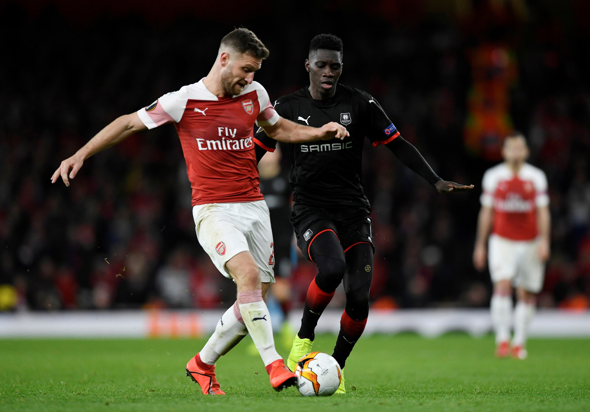 Soccer Football - Europa League - Round of 16 Second Leg - Arsenal v Stade Rennes - Emirates Stadium, London, Britain - March 14, 2019 Arsenal's Shkodran Mustafi in action with Stade Rennes' Ismaila Sarr Action Images via Reuters/Tony O'Brien