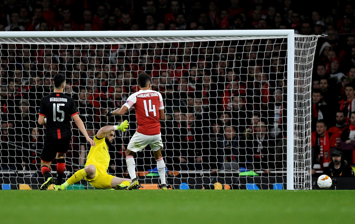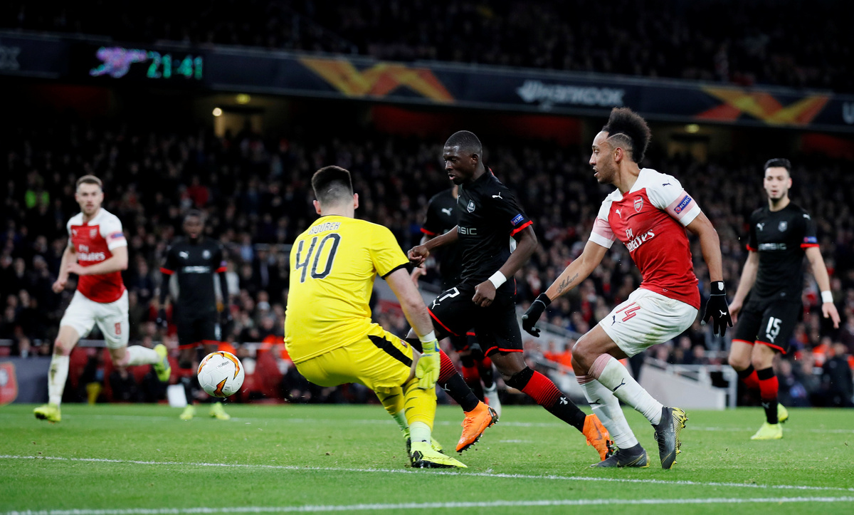 LONDON (Reuters) - Arsenal striker Pierre-Emerick Aubameyang struck twice as his side beat Stade Rennes 3-0 to reach the Europa League quarter-finals and join Chelsea, who earlier on Thursday thrashed Dynamo Kiev 5-0 with a hat-trick from Oliver Giroud.