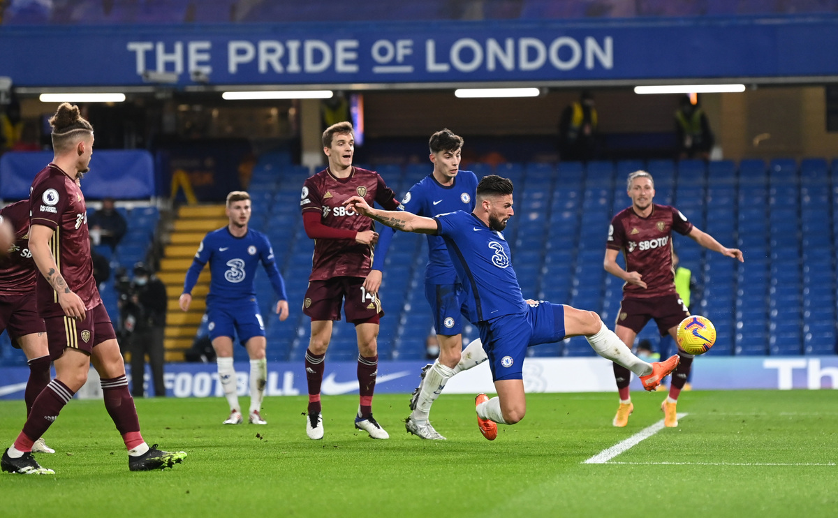 Chelsea moved to the top of the Premier League as they came from behind to beat Leeds United 3-1 at home on Saturday, set on their way by a fifth goal in four days from striker Olivier Giroud.