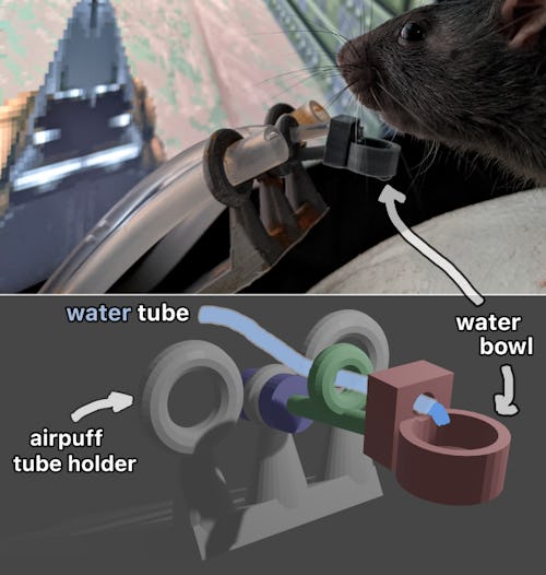 Framing the project was a VR setup that automatically trained rodents to maneuver within 3D environments — at its core was a polystyrene ball that was maneuverable by ball bearings. The rats would run on the surface of the ball, its movement being tracked by motion sensors, ultimately corresponding to their player moving forward in the game.