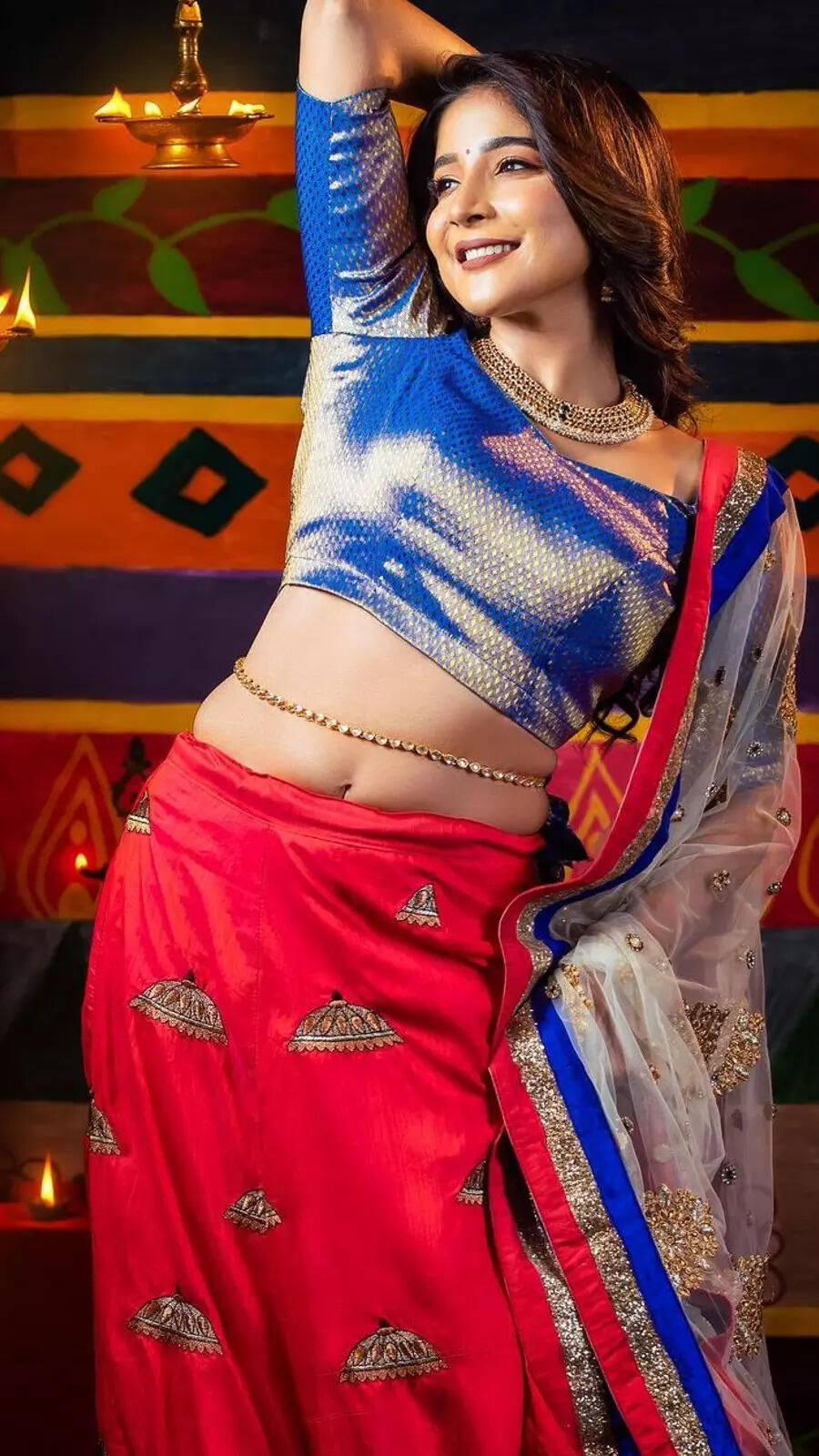 The dazzling actress shines well with her grand Diwali half saree look.