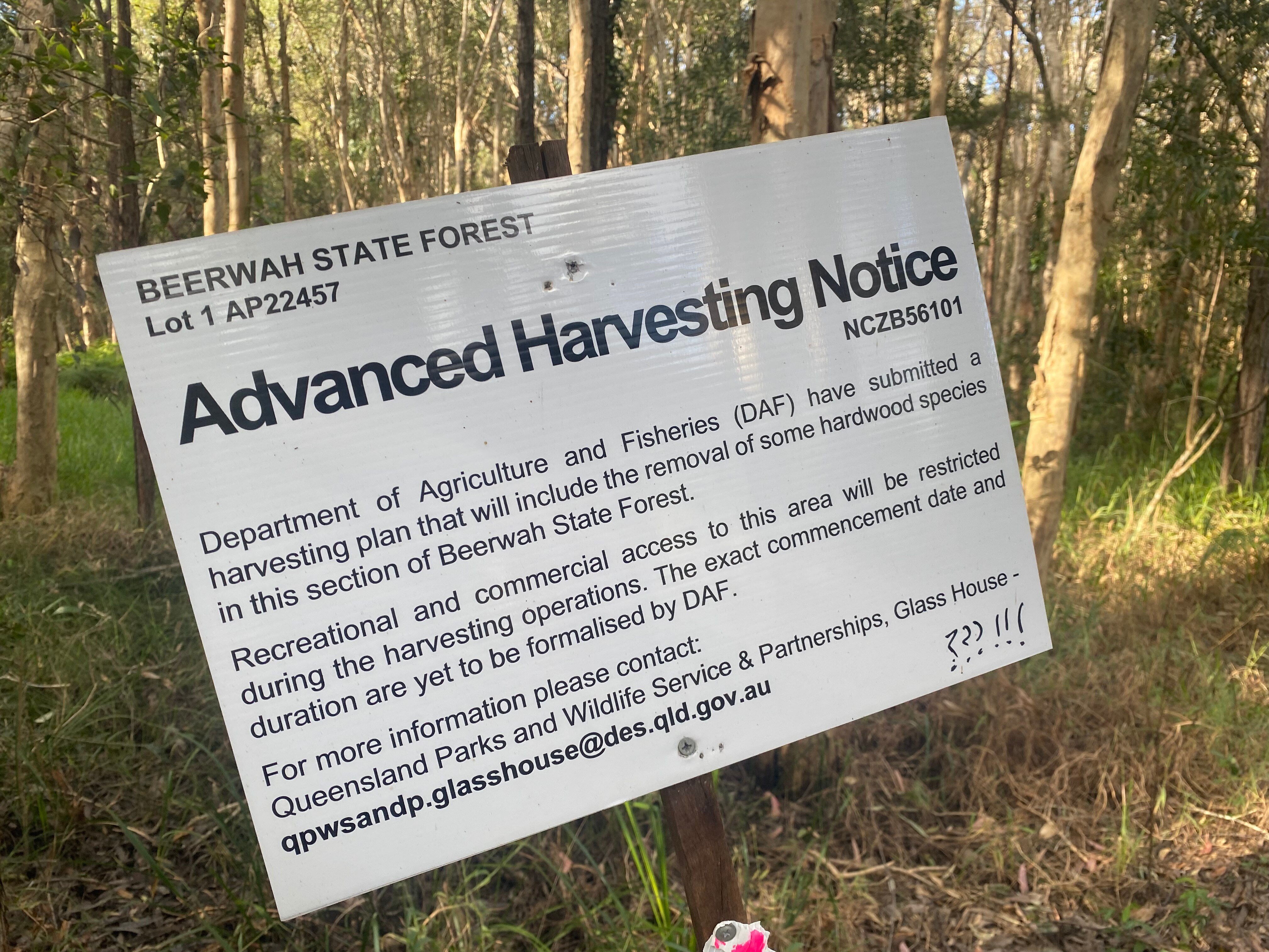 Signs showing the government's plans to selectively harvest some species of hardwood trees in parts of the Beerwah State Forest in 2022 were put up in December last year.
