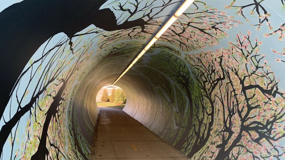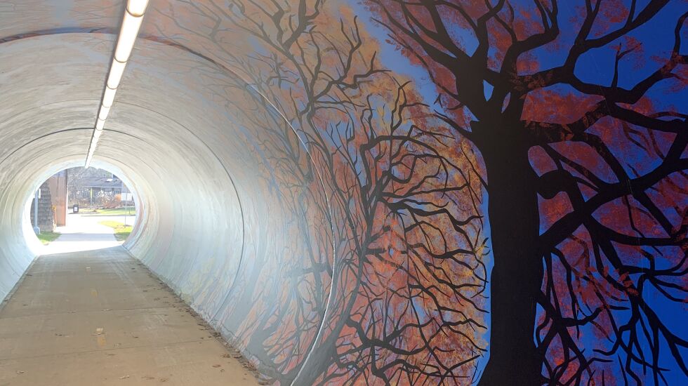 Maple, apple, oak, ash and honey locust trees are shown in images that consume the tube-like space, which is 12 feet in diameter and stretches more than 90 feet beneath railroad tracks in a residential area of the west suburb.