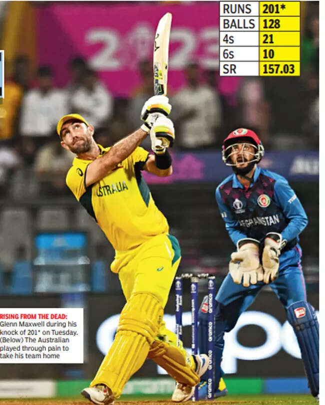 As Australian captain Pat Cummins rightly put it, Maxwell’s magical, unbeaten double hundred-a blistering 128-ball 201*, studded with 21 fours and 10 sixes, which pulled Australia out from the jaws of a defeat against Afghanistan for an improbable three-wicket win at the Wankhede Stadium on Tuesday night, left you a special feeling that such knocks evoke when you are in the stadium when such acts are performed: “I was there.” From a man known popularly as the ‘Big Show,’ this was indeed the ‘show of a lifetime.’