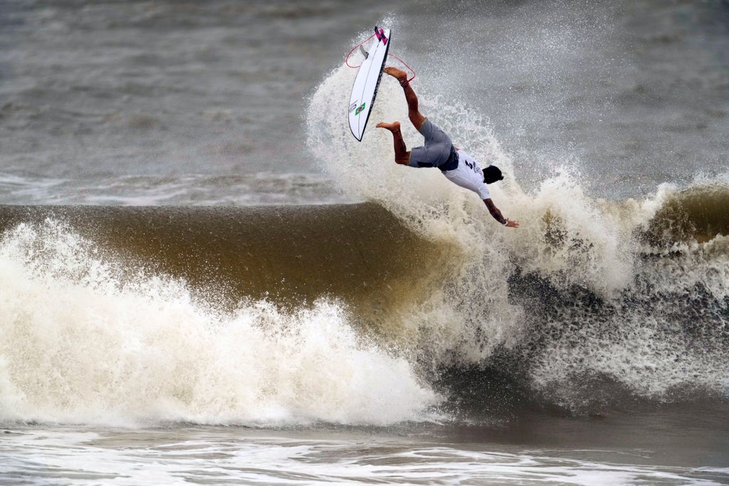 On the beach about 60 miles east of Tokyo Olympic surfers are enjoying waves created by an approaching typhoon that has disrupted some outdoor events — and made the proceedings feel even more dramatic, both in life and on camera.