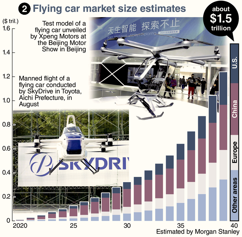 Morgan Stanley has predicted that flying cars will become a leading industry and that the economy will grow to about 1.5 trillion dollars (160 trillion yen) in 2040. Provided flying cars become popular in a "bullish scenario," the market is expected to nearly double to 2.9 trillion dollars.
