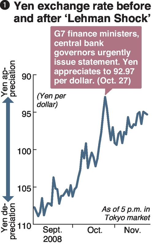 At the time, the yen was soaring against the dollar (see chart 1). Many traders were buying the Japanese currency -- considered a safe asset -- in a drastic move to avoid risk in the wake of the crisis. One dollar was worth over 100 yen in mid-October, but the yen surged as the dollar dropped to a little above 95 yen on Oct. 24. Later on the same day, European time, it plunged to slightly over 90 yen.