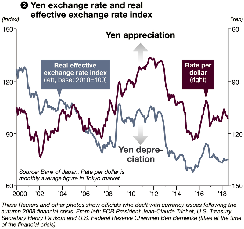 Based on this line of thinking, the Treasury's monetary policy is not easy on Japan, which has a large current account surplus. In the summer of 2007, Europeans pointed to Japan's large current account surplus and the yen's substantial undervaluation (see chart 2) based on the real effective exchange rate (see below) and pressed Tokyo hard behind the scenes to correct the undervaluation. The real effective exchange rate is an index often cited among officials.