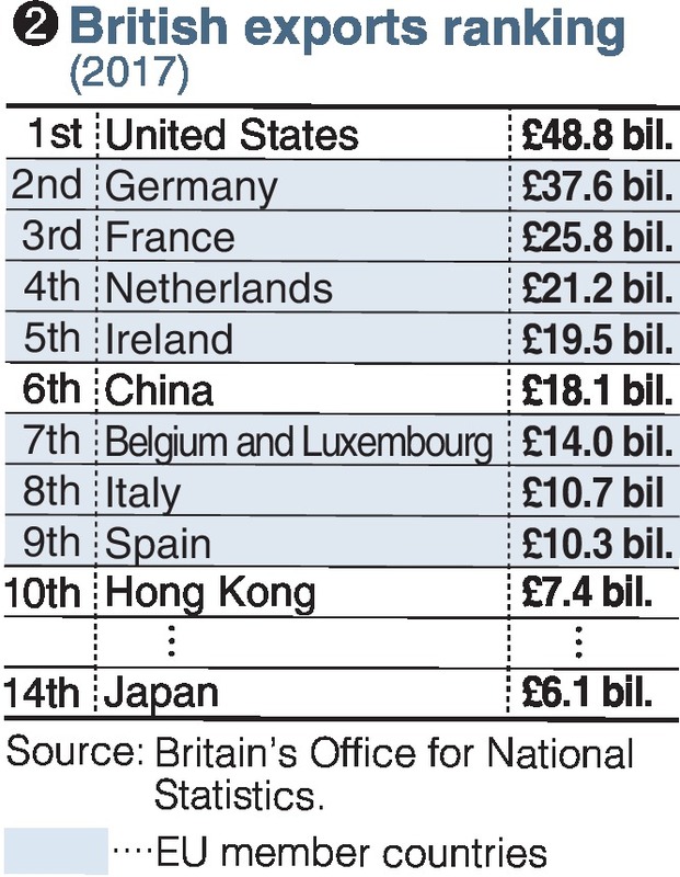 The EU is Britain's top market for exports. According to British government statistics, EU countries accounted for seven of its top 10 export destinations in 2017, the exceptions being the United States in first place, China in sixth and Hong Kong in 10th (see chart 2).