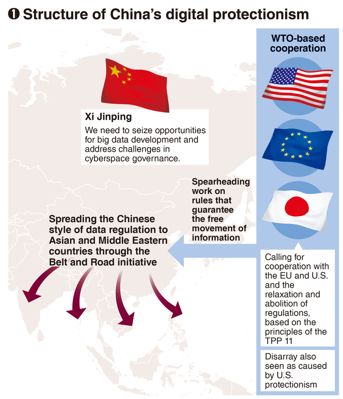 This assertion was part of an address by Akira Amari, former minister in charge of economic revitalization, in early May at the Brookings Institution in Washington. He expressed wariness over China's efforts to cordon off both domestic and foreign data. Amari also noted the need for rules like those established in the Trans-Pacific Partnership to end such unfair actions, calling for the United States to return to the trade pact.