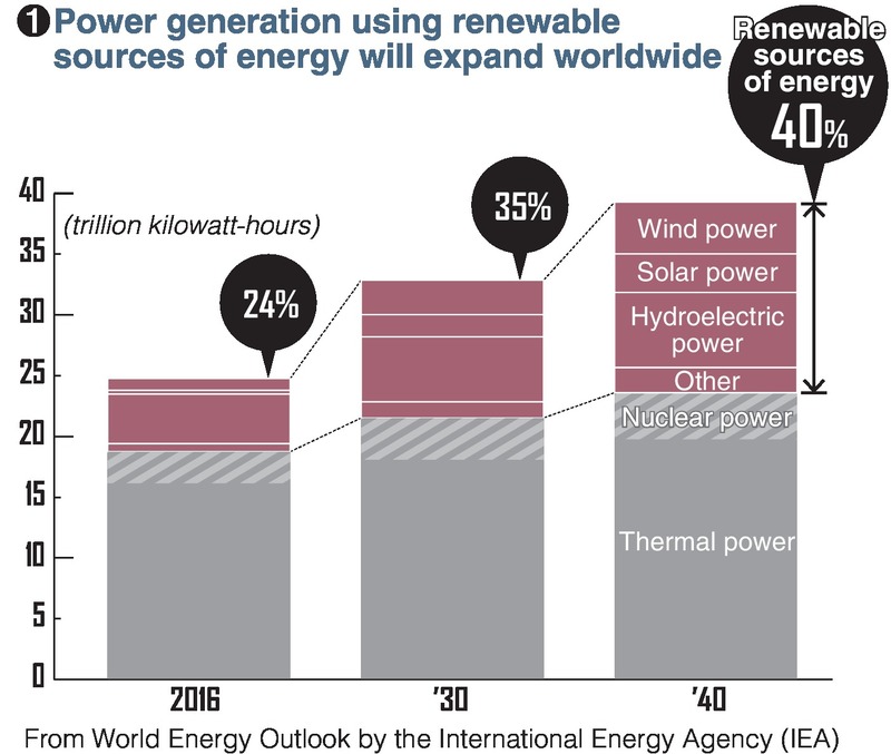 In the World Energy Outlook released by the International Energy Agency in November, renewable energy sources accounted for 24 percent of global power generation amounts in 2016. This is estimated to increase to 40 percent in 2040 (see chart 1). Renewable energy use is expanding to meet rapidly growing demand stemming from the economic development of emerging nations.