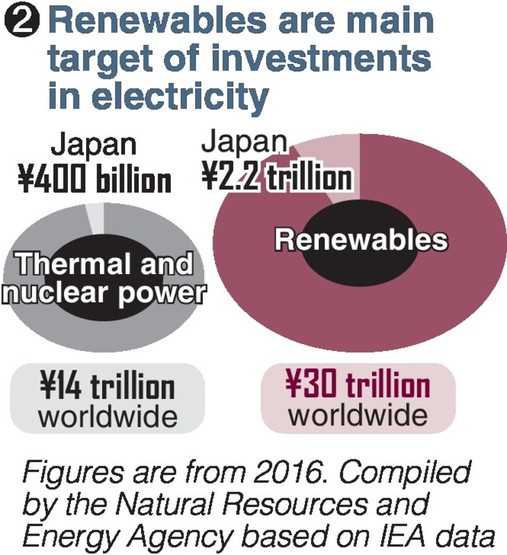 Global investment in renewable energy in 2016 totaled about 30 trillion yen, double the about 14 trillion yen (see chart 2) invested in thermal and nuclear power.