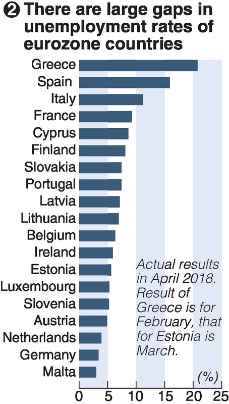 Large differences also are evident in unemployment rates (see chart 2). The highest jobless rate -- above 20 percent, meaning one in five people is out of work -- is in Greece. The rate tops 10 percent in Spain and Italy. By contrast, Germany and the Netherlands have jobless rates of between 3 percent and 4 percent, meaning they almost have full employment.