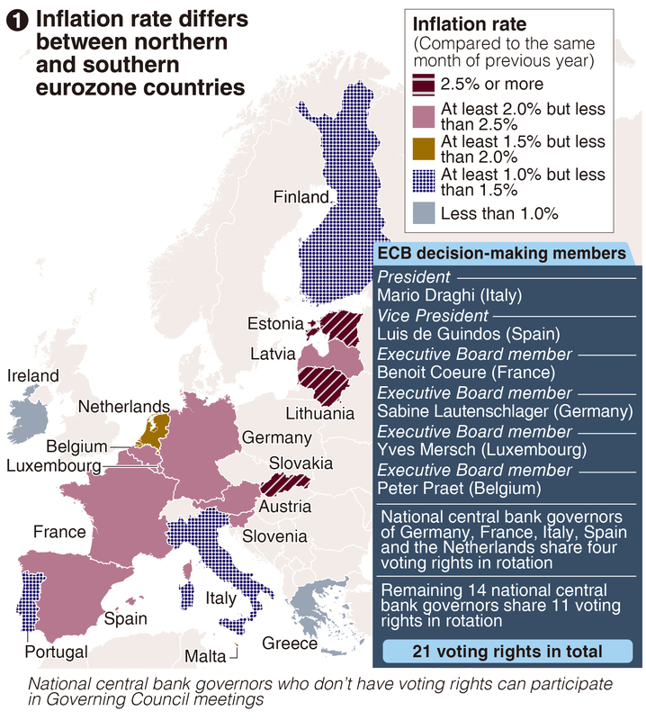 While the ECB implements unified monetary policies for the 19-nation eurozone, it needs to hold the varying inflation rates of its member nations in check and ensure price instability does not roil the entire bloc.