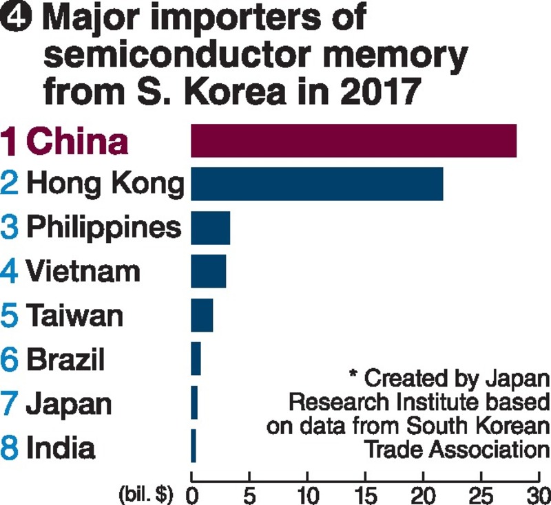 South Korea is also likely to suffer from the intensifying trade friction between Washington and Beijing. When we look at South Korean exports by recipient country or region, China is the top destination, accounting for a quarter of the total (see chart 3). The value of semiconductor memory exports from South Korea, which boasts strength in the sector, to China and Hong Kong is also very high (see chart 4).