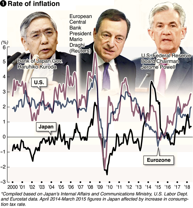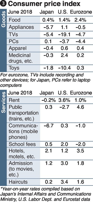 While price rises in the United States and Europe are sluggish, they are still higher than in Japan. The U.S. consumer price index for June rose nearly 3 percent over the same month last year, and also rose in the eurozone by 2.1 percent in July, topping Japan's 0.7 percent in June.