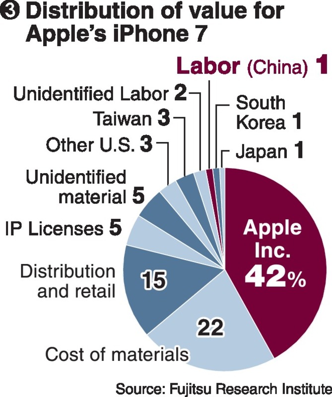 According to the Fujitsu Research Institute's analysis of the distribution of value associated with Apple's iPhone 7, Apple itself accounts for 42 percent, while the corresponding figure for Chinese labor, which is responsible for the assembly of the device, is only 1 percent (see chart 3).
