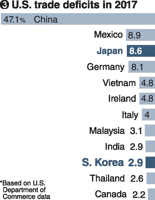 The U.S. trade deficit with Japan is larger than the one it has with South Korea. Having insisted on a bilateral agreement at the recent summit talks, the Trump administration is expected to increase pressure on Japan over FTA negotiations. A senior Japanese government official voiced concern over a possibility that the U.S.-South Korea FTA would "set the tone" for trade negotiations between the United States and Japan.