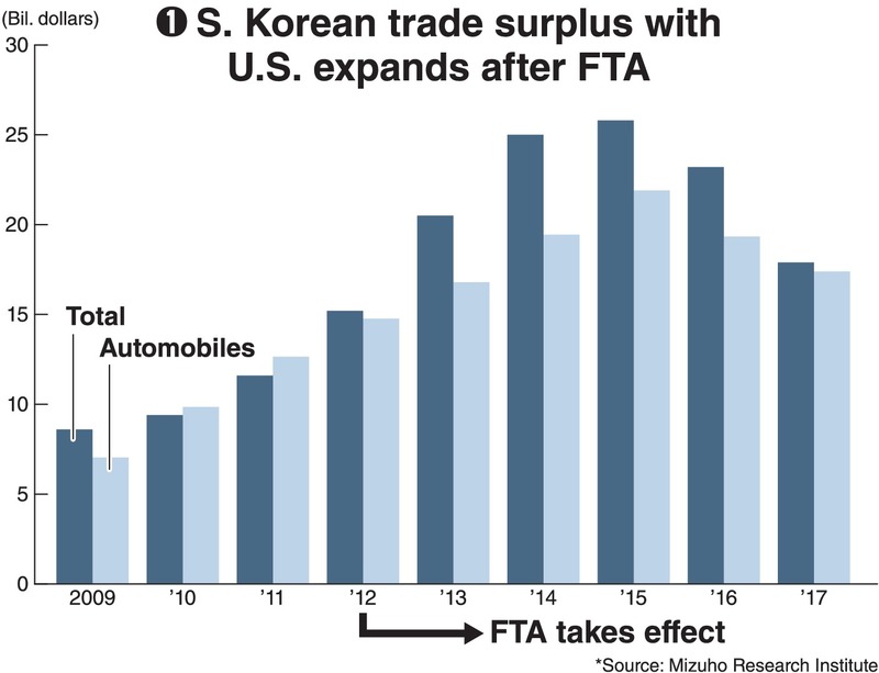 "Some people in South Korea hold a favorable view on [the review of the U.S.-South Korea FTA agreement] because it protected the agricultural sector, among others. But on the other hand, South Korea ended up being forced to swallow U.S. demands on many items, because [the trade issue] was linked [by the United States] to the security issue," said Shinobu Kikuchi, a senior researcher at Mizuho Research Institute.