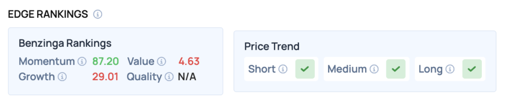 Benzinga Edge Rankings: Underscoring Monday’s move, Benzinga Edge rankings show the stock has an exceptional Momentum score of 87.20.