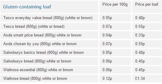 A standard Tesco white or brown bread cost from 0.5 to 0.7 per 100g. Its gluten-free alternative costs more than four times the price at 36p per 100g, Coeliac UK found in their December 2015 research.