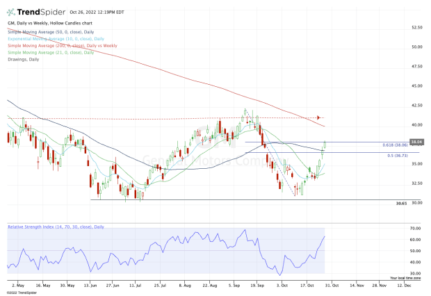 They want to see the stock clear the $37 to $38 area, which is littered with the key measures mentioned above. If GM can clear this zone, it puts a much bigger area on watch, between $40 and $42.