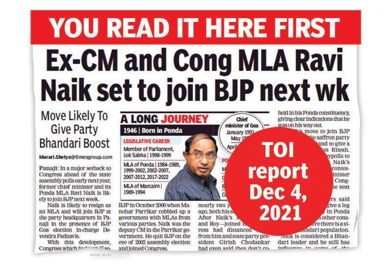 PANAJI: In a major jolt to Congress ahead of the assembly election, former chief minister Ravi Naik on Tuesday resigned as MLA and rejoined BJP after 19 years. TOI had reported on Sunday that such a move was imminent.