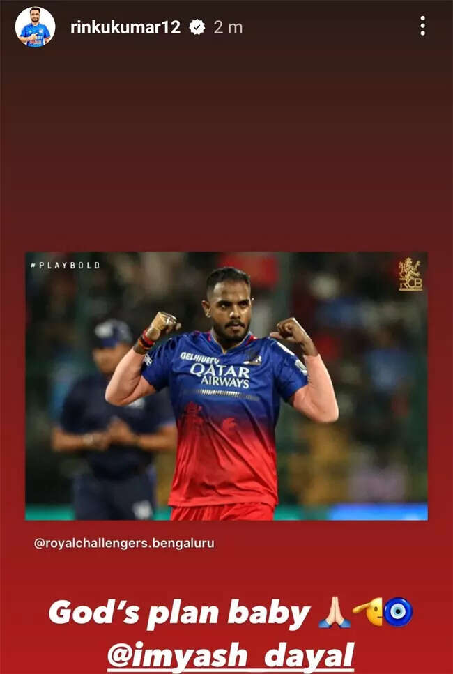 After the match, Rinku came up with a warm Instagram story, which was almost a virtual hug from KKR batsman to Dayal.