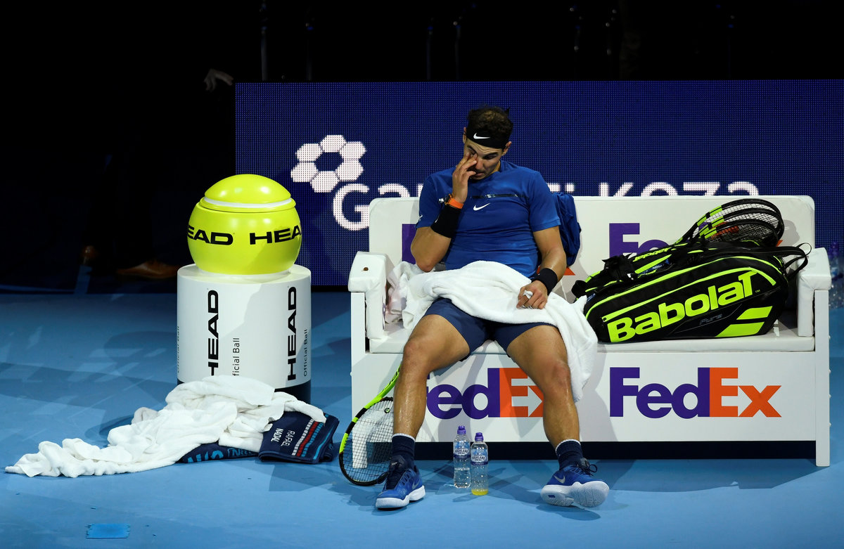 The Spaniard, already assured of ending the year as world number one having won a 10th French Open title and the U.S. Open, was clearly hobbling as he went down 7-6(5) 6-7(4) 6-4.