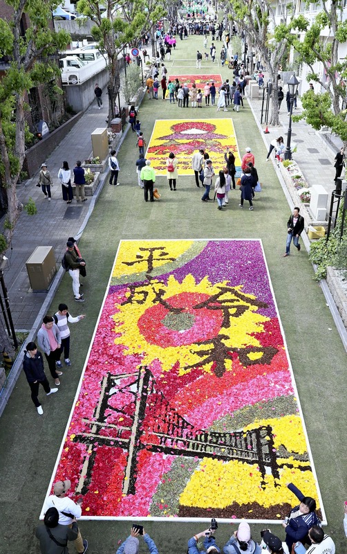 An art exhibition in which "Heisei" and "Reiwa" are depicted using flower petals is seen at Kitanozaka in Chuo Ward, Kobe, on Saturday, the first day of Golden Week. Local residents and store owners arranged tulips, wood chips and other materials across a space 10 meters long and 5 meters wide to depict the Akashi-Kaikyo Bridge and the two era names. The exhibition is part of the "Infiorata Kobe 2019" series of flower art set up along roads and at parks, and will last through Monday.
