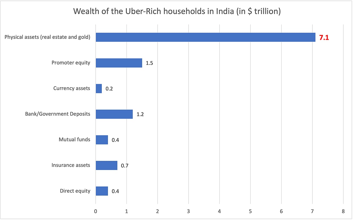 This has led to a situation where the ultrawealthy just like the idea of putting their money in real estate and gold, which are both speculative assets. This explains why the uber-rich hold real estate and gold worth $7.1 trillion, whereas promoter’s equity – or the total amount of capital invested in business – is at a significantly lower $1.5 trillion. They find it easier to speculate than to invest and build things.