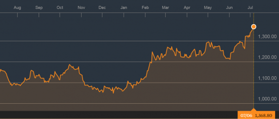 Gold for immediate delivery advanced as much as 1.1 per cent to $1,371.39 an ounce in London, the highest level since March 2014, and traded at $1,368.70 by 12:33 pm in Singapore, extending gains to a sixth session.