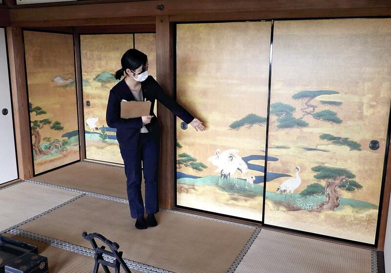 The gold sliding doors were used mainly in the changing room areas of the residence, and the artwork was said to have been the work of a painter of the Kano School during the Meji era (1868-1912). The doors stand 1.8 meters and are 90 centimeters wide, and feature cranes and pine trees.