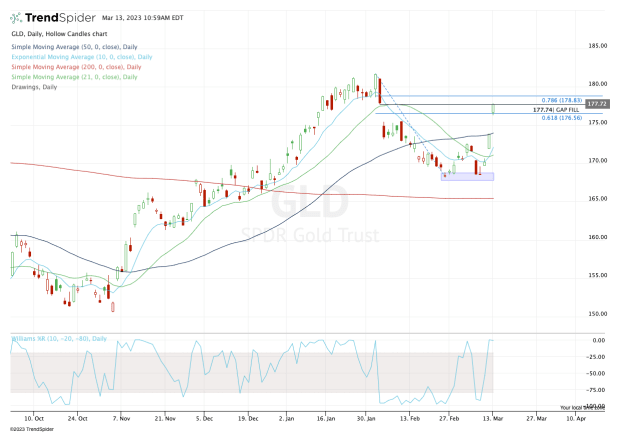 That level comes into play near the 50-day moving average and above the 10-day and 21-day moving averages. Ideally, bulls will want to see the GLD ETF hold these levels if it does go on to fill the gap near $174 sometime in the next few days or weeks.