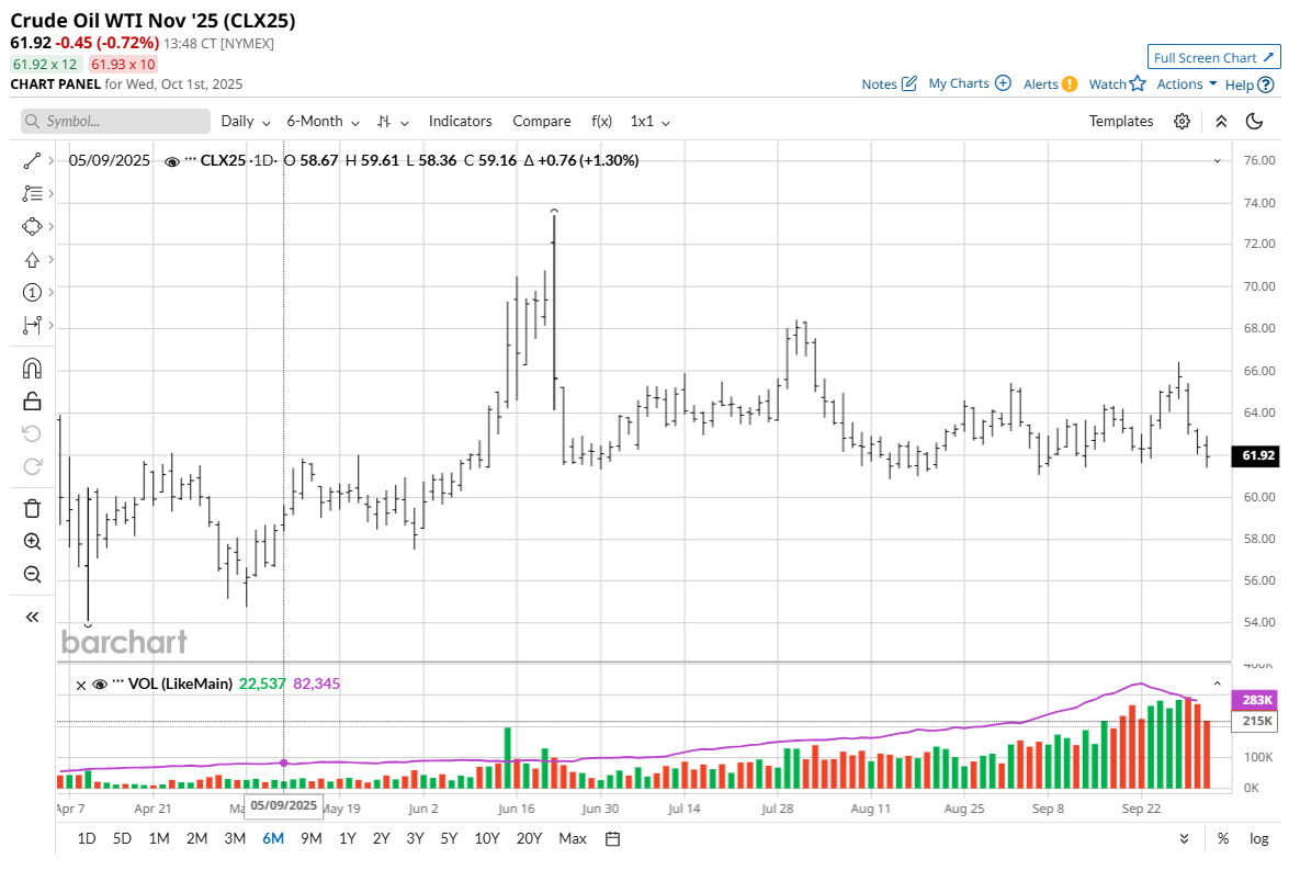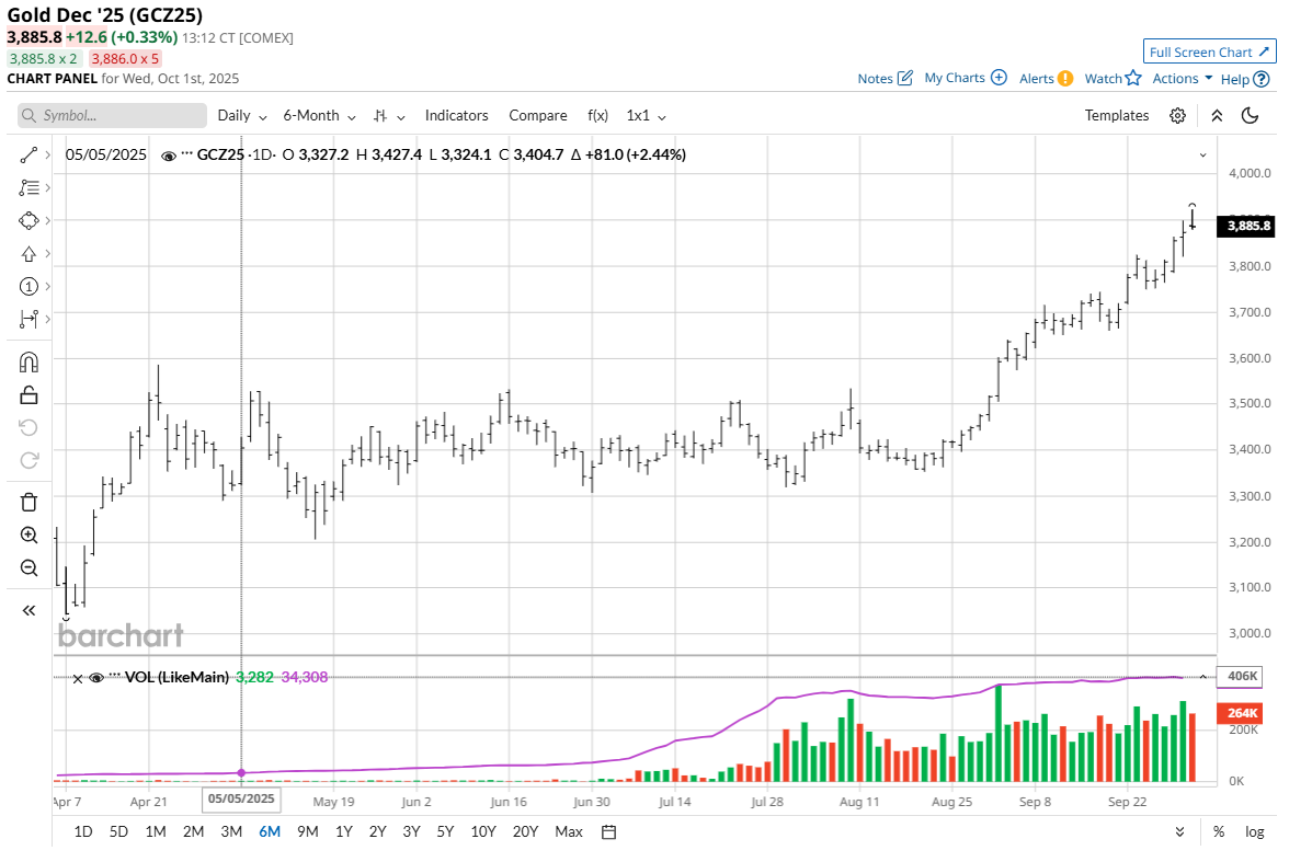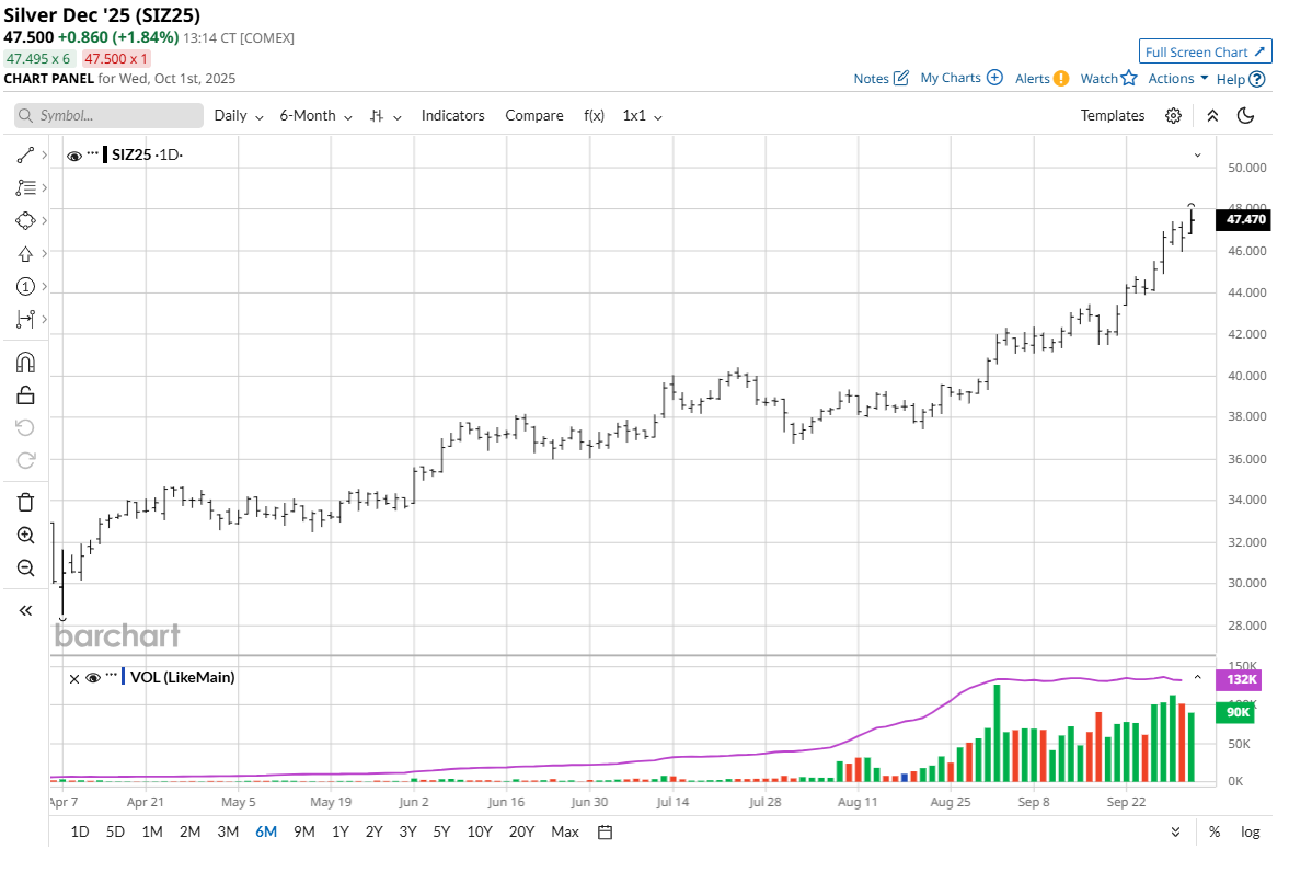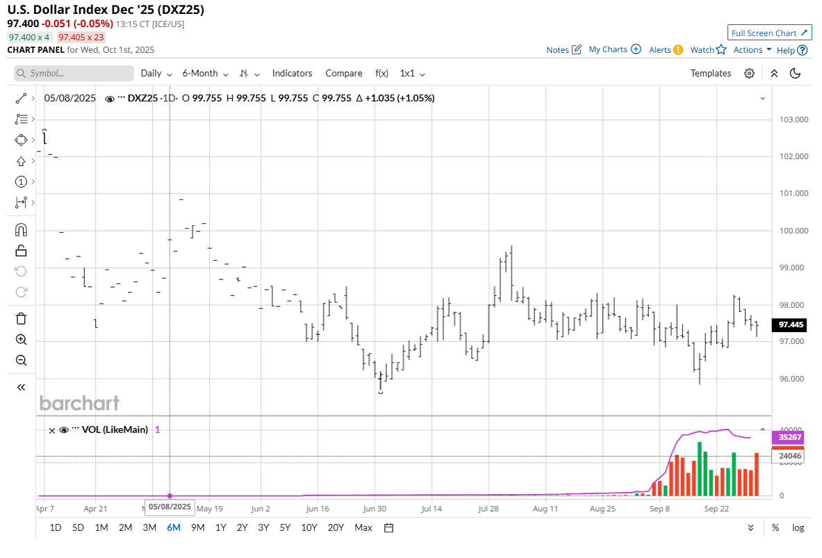 Gold (GCZ25) prices overnight hit another record high of $3,922.70, basis December Comex futures. Siver (SIZ25) prices scored another 14-year high of $47.825 in December futures. Better safe-haven demand amid the uncertainty of the U.S. government shutting down at midnight last night is the latest bullish catalyst for the two precious metals.