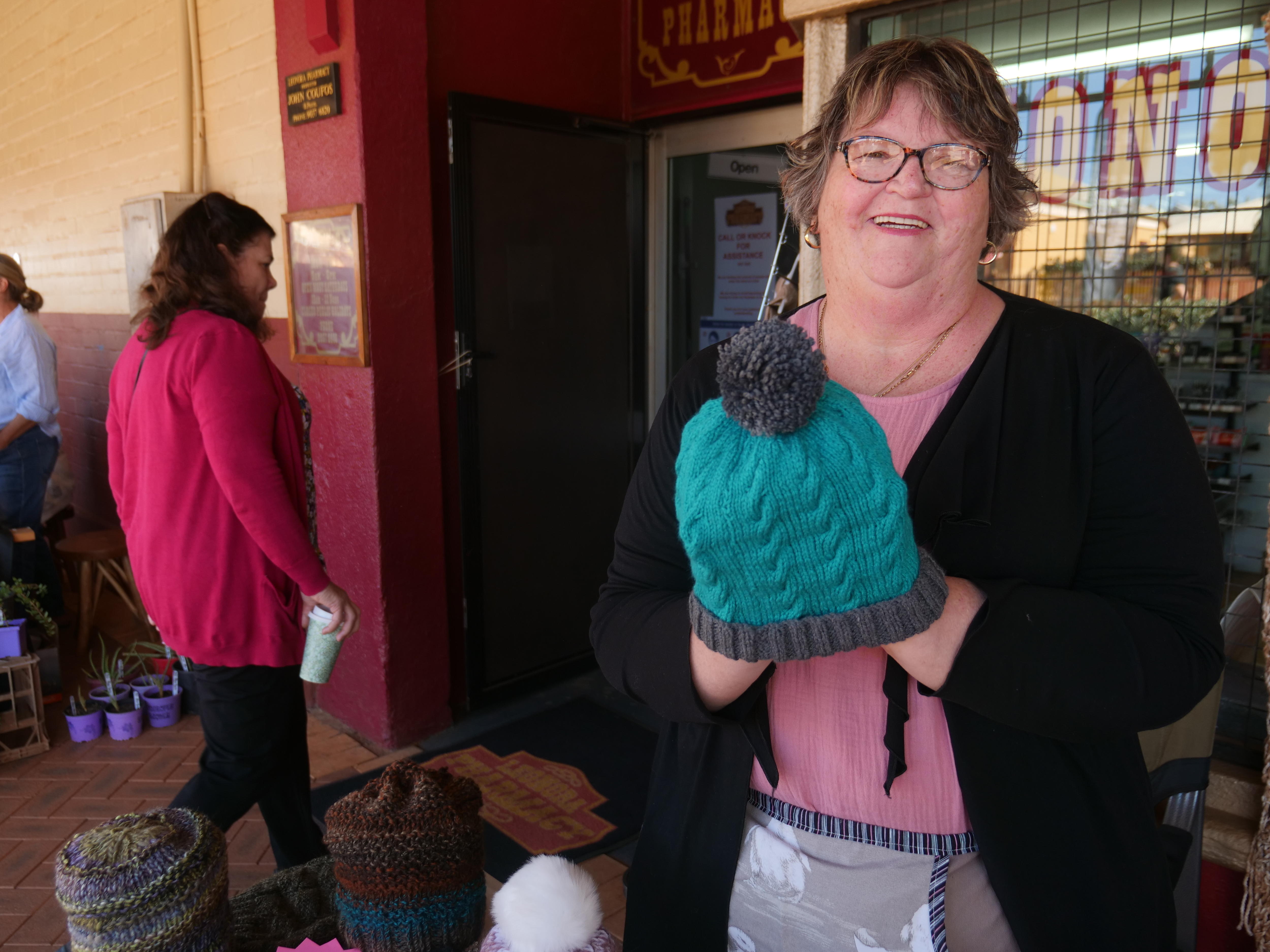Diagnosed with breast cancer in 2020, Ms Mavros took to knitting to keep her spirits up; a hobby that is now helping to keep the heads of Leonora folks warm.