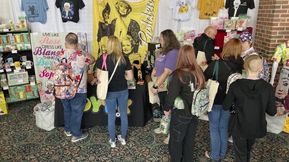 Like any “con,” there are panels and Q&As with people who guest-starred or worked behind the scenes. There is a vendors market with booths carrying “Golden Girls” themed candles, masks, T-shirts and other merch. Fans can snap photos in a recreation of the kitchen where the “girls” always ate cheesecake as well as a giant replica of Sophia’s trademark purse. There are also two separate drag queen groups scheduled to perform tributes.
