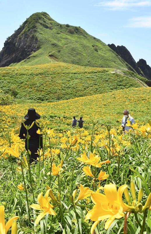 Hikers walk through a field of Tobishima-kanzo, or amur daylilies, that are in full bloom on Sado Island in the picturesque Onogame area. The perennials are only found on Sado Island in Niigata Prefecture and Tobishima island in Yamagata Prefecture. About 1 million of the bright, golden-yellow daylilies grow at the base of a hill on the seashore. The flowers can be seen until around June 10.