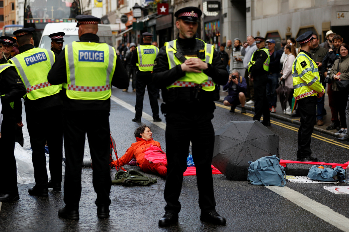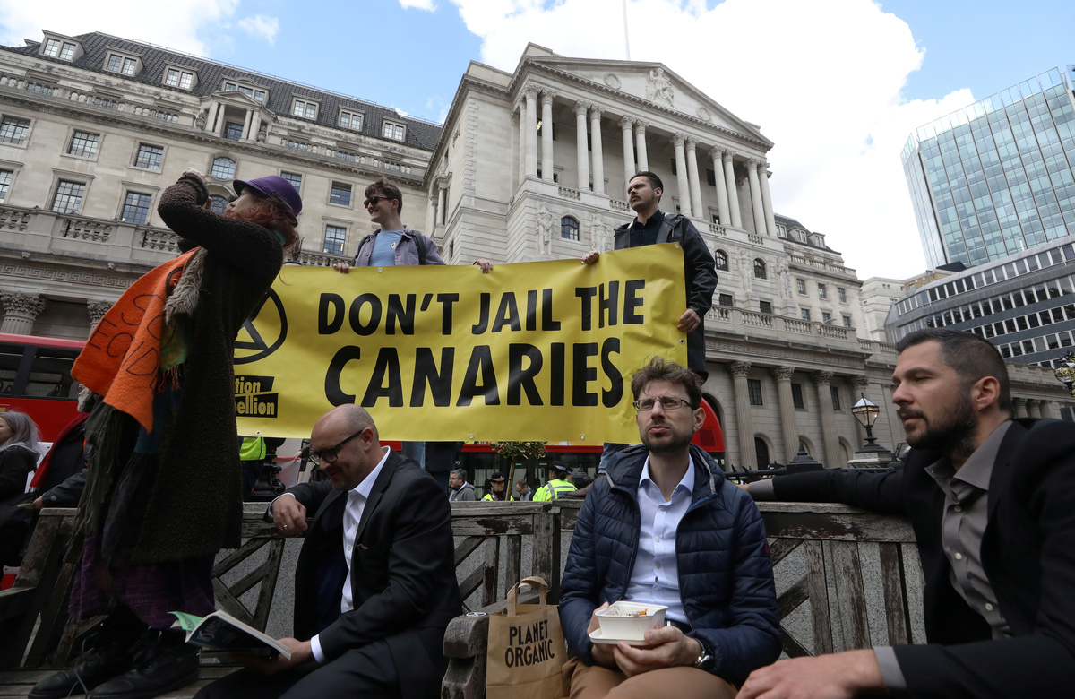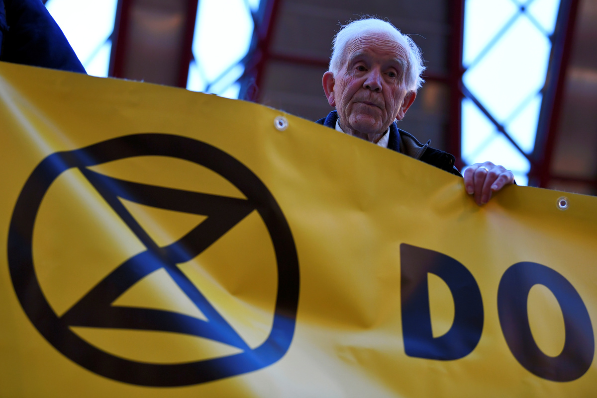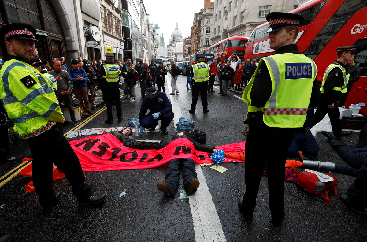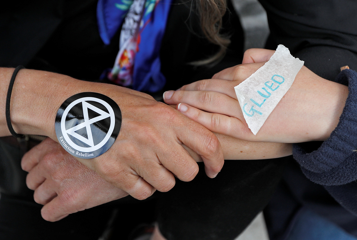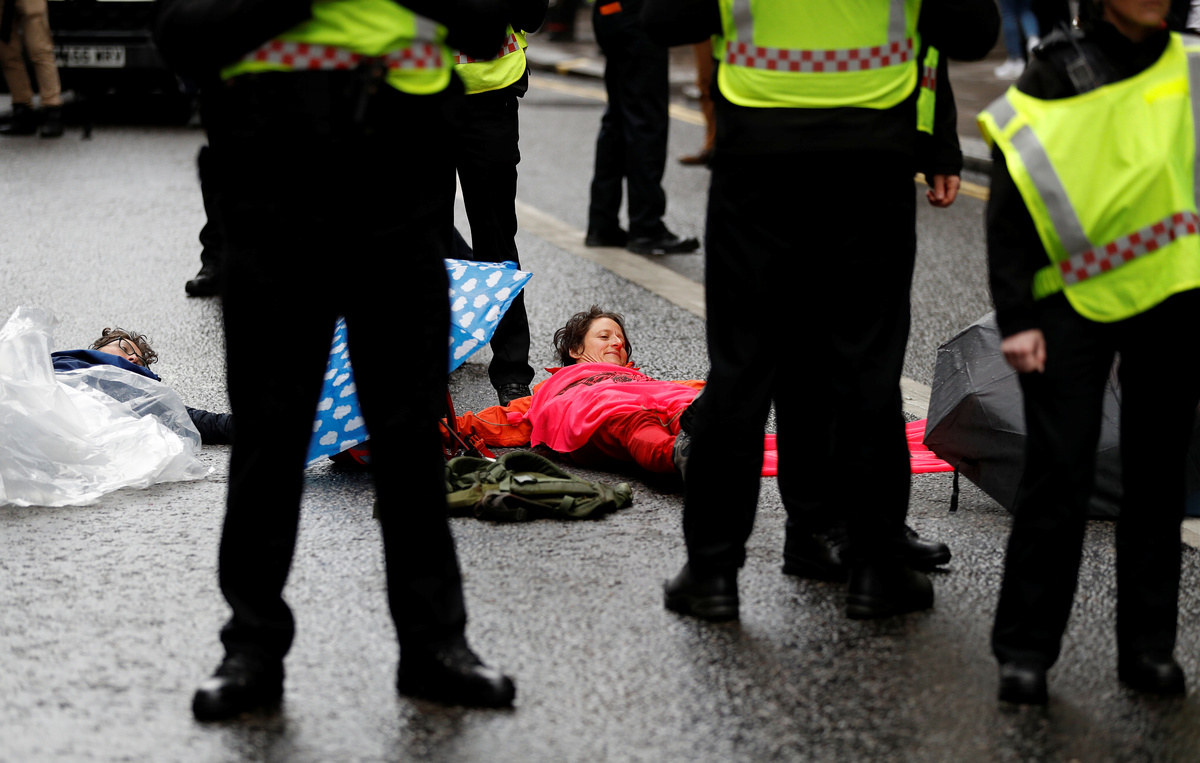 Protesters block traffic outside The Bank of England during the Extinction Rebellion protest in London, Britain April 25, 2019. REUTERS/Simon DawsonProtesters block traffic outside Nomura Bank during the Extinction Rebellion protest London, Britain April 25, 2019. REUTERS/Simon DawsonProtesters block traffic outside The Bank of England during the Extinction Rebellion protest London, Britain April 25, 2019. REUTERS/Simon DawsonA protester is taken away by police as demonstrators block traffic at Fleet Street during the Extinction Rebellion protest in London, Britain April 25, 2019. REUTERS/Peter NichollsA protester is taken away by police as demonstrators block traffic at Fleet Street during the Extinction Rebellion protest in London, Britain April 25, 2019. REUTERS/Peter NichollsA protester wears a protective mask put by the police as they attempt to remove protective casing in which a she has put her hand, as protesters block traffic at Fleet Street during the Extinction Rebellion protest in London, Britain April 25, 2019. REUTERS/Peter NichollsPolice attempt to remove protesters lying on the road as they block traffic at Fleet Street during the Extinction Rebellion protest in London, Britain April 25, 2019. REUTERS/Peter NichollsA protester is taken away by police as demonstrators block traffic at Fleet Street during the Extinction Rebellion protest in London, Britain April 25, 2019. REUTERS/Peter NichollsPolice surround a demonstrator lying on the road as demonstrators block traffic at Fleet Street during the Extinction Rebellion protest in London, Britain April 25, 2019. REUTERS/Peter NichollsA protester is taken away by police as demonstrators block traffic outside The Bank of England during the Extinction Rebellion protest in London, Britain April 25, 2019. REUTERS/Simon DawsonClimate protesters glued their hands together in front of HM Treasury in Westminster during the Extinction Rebellion protest in London, Britain April 25, 2019. REUTERS/Peter NichollsA protester is taken away by police as demonstrators block traffic at Fleet Street during the Extinction Rebellion protest in London, Britain April 25, 2019. REUTERS/Peter NichollsPolice surround demonstrators lying on the road as they block traffic at Fleet Street during the Extinction Rebellion protest in London, Britain April 25, 2019. REUTERS/Peter NichollsProtesters pray on top of a train block traffic at Canary Wharf Station during the Extinction Rebellion protest in London, Britain April 25, 2019. REUTERS/Dylan MartinezPhil Kingston, 83, sits on top of a DLR train as demonstrators block traffic at Canary Wharf Station during the Extinction Rebellion protest in London, Britain April 25, 2019. REUTERS/Dylan MartinezPhil Kingston, 83, sits on top of a DLR train as demonstrators block traffic at Canary Wharf Station during the Extinction Rebellion protest in London, Britain April 25, 2019. REUTERS/Dylan MartinezPhil Kingston, 83, sits on top of a DLR train as demonstrators block traffic at Canary Wharf Station during the Extinction Rebellion protest in London, Britain April 25, 2019. REUTERS/Dylan MartinezA police officer tries to remove the hand of protester Diana Warner, glued to a train, as demonstrators block traffic at Canary Wharf Station during the Extinction Rebellion protest in London, Britain April 25, 2019. REUTERS/Dylan MartinezPolice stands guards as demonstrators glue their hands to the London stock exchange during the Extinction Rebellion protest in London, Britain April 25, 2019. REUTERS/Simon DawsonPhil Kingston, 83, takes part in a demonstration blocking the traffic at Canary Wharf Station, during the Extinction Rebellion protest in London, Britain April 25, 2019. REUTERS/Dylan MartinezDemonstrators stand on top of a DLR train as they block the traffic at Canary Wharf Station, during the Extinction Rebellion protest in London, Britain April 25, 2019. REUTERS/Dylan MartinezPolice stands guard as demonstrators glue their hands to the London stock exchange during the Extinction Rebellion protest in London, Britain April 25, 2019. REUTERS/Simon Dawson