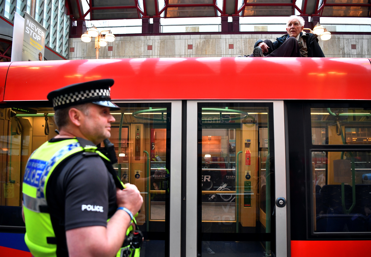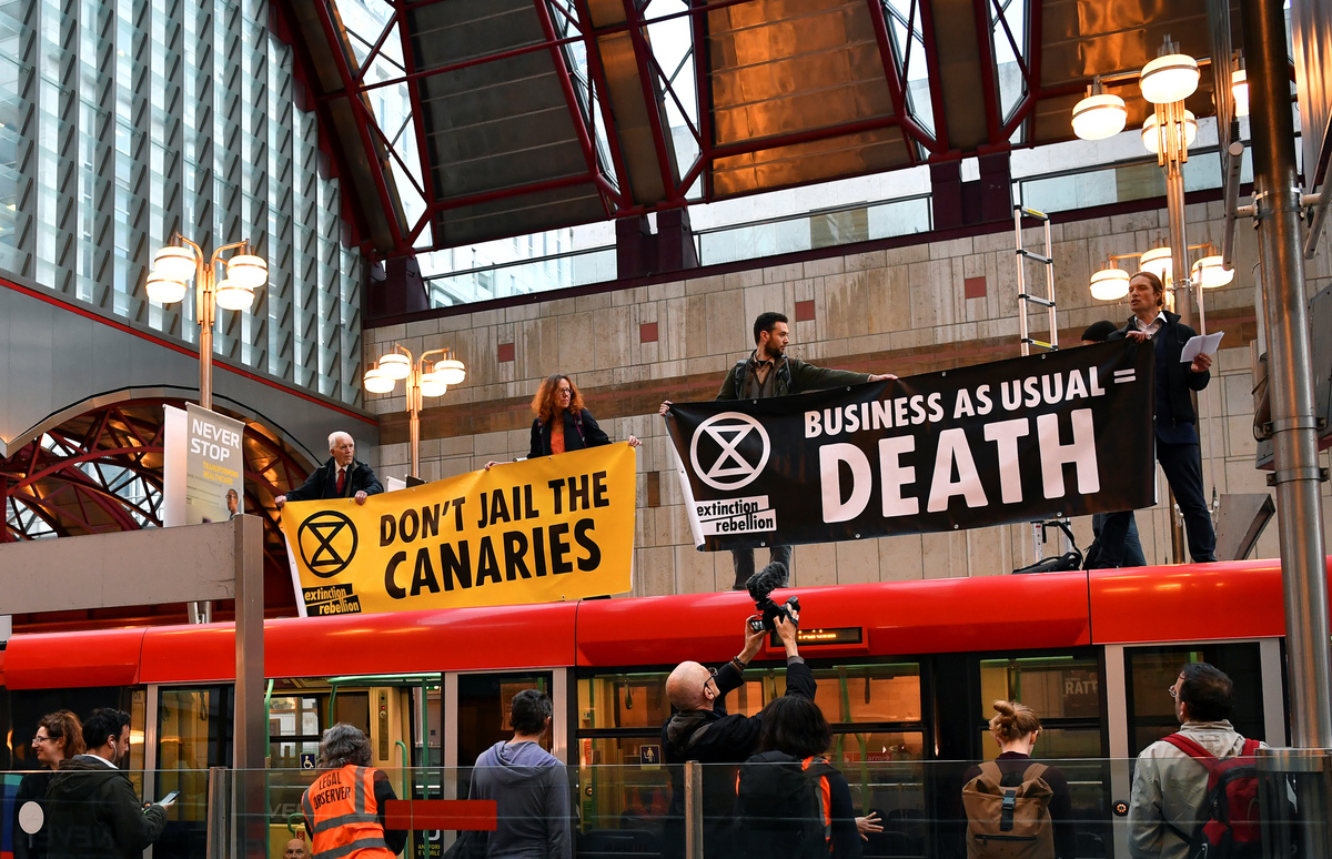 In Canary Wharf, five protesters from the group climbed aboard a train at the Docklands Light Railway (DLR) station and unfurled a banner which read: "Business as usual = Death". One glued herself to a train.