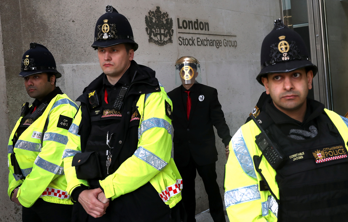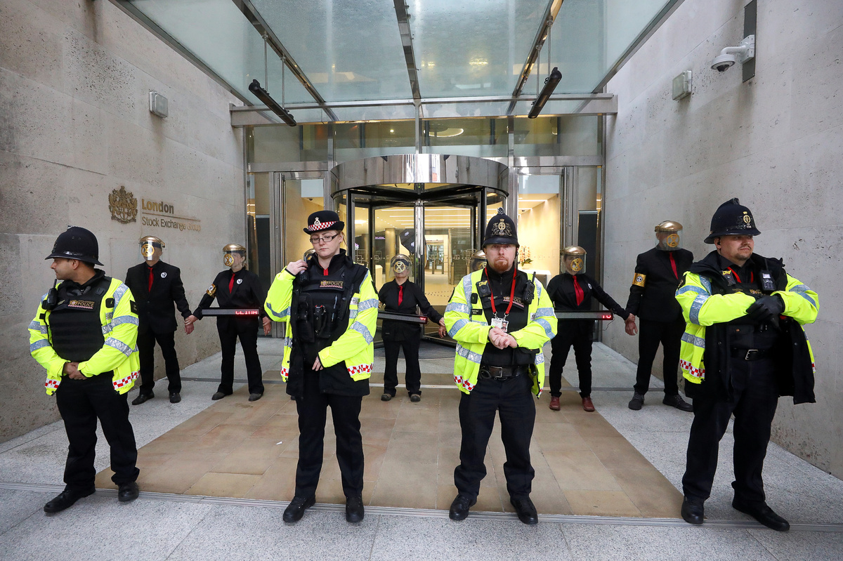 At the London Stock Exchange's headquarters, seven protesters dressed in black suits and red ties were blocking the revolving doors of the building. They held signs reading "Tell the truth" and "You can’t eat money".