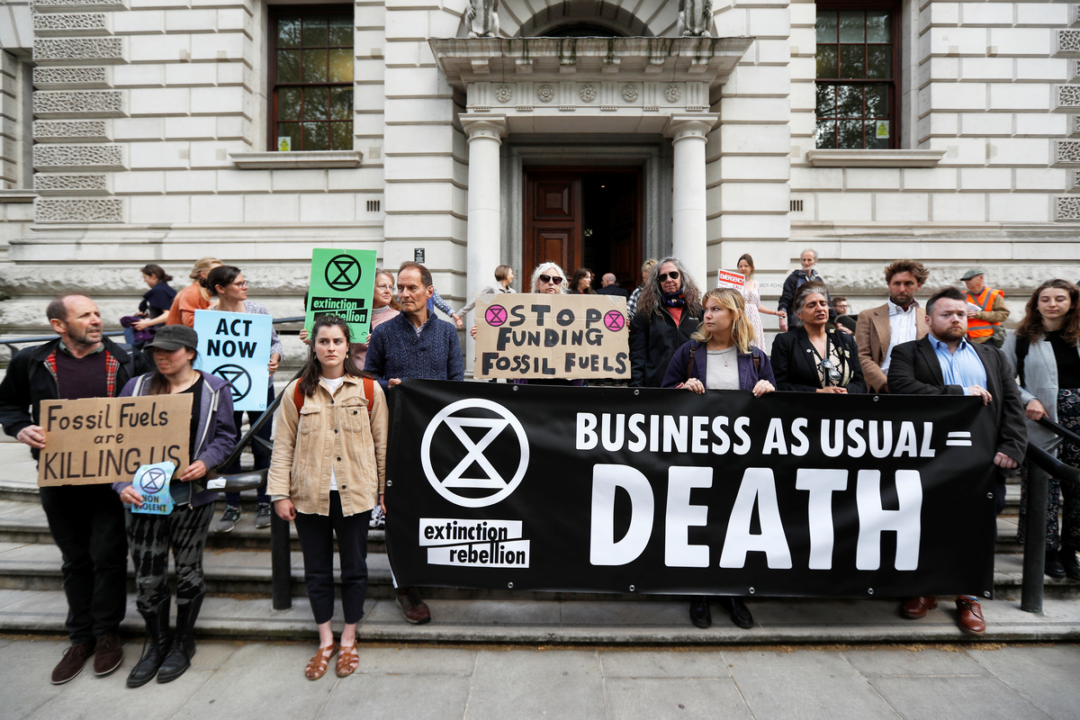 Climate protesters hold placards in front of HM Treasury in Westminster during the Extinction Rebellion protest in London, Britain April 25, 2019. REUTERS/Peter Nicholls