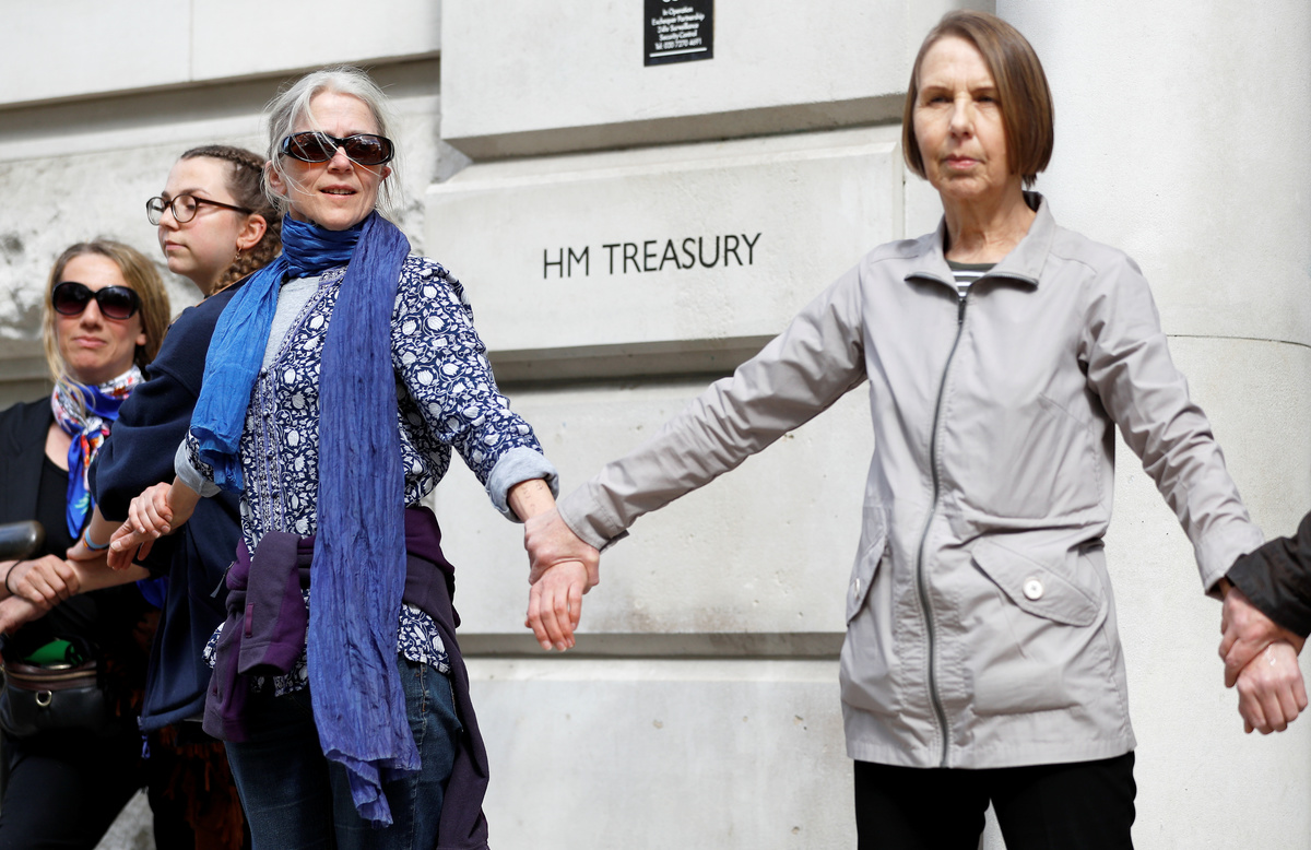 The activists also held protests outside other banks including Rothschild, Nomura, Deutsche Bank. Eight protesters glued themselves together with their arms around the handrail to the Treasury, according to a Reuters photographer at the scene.