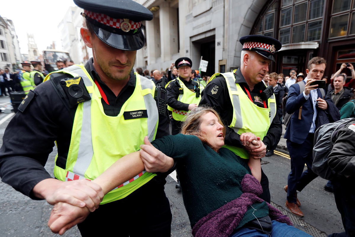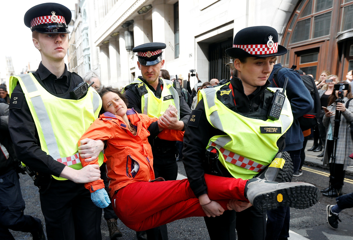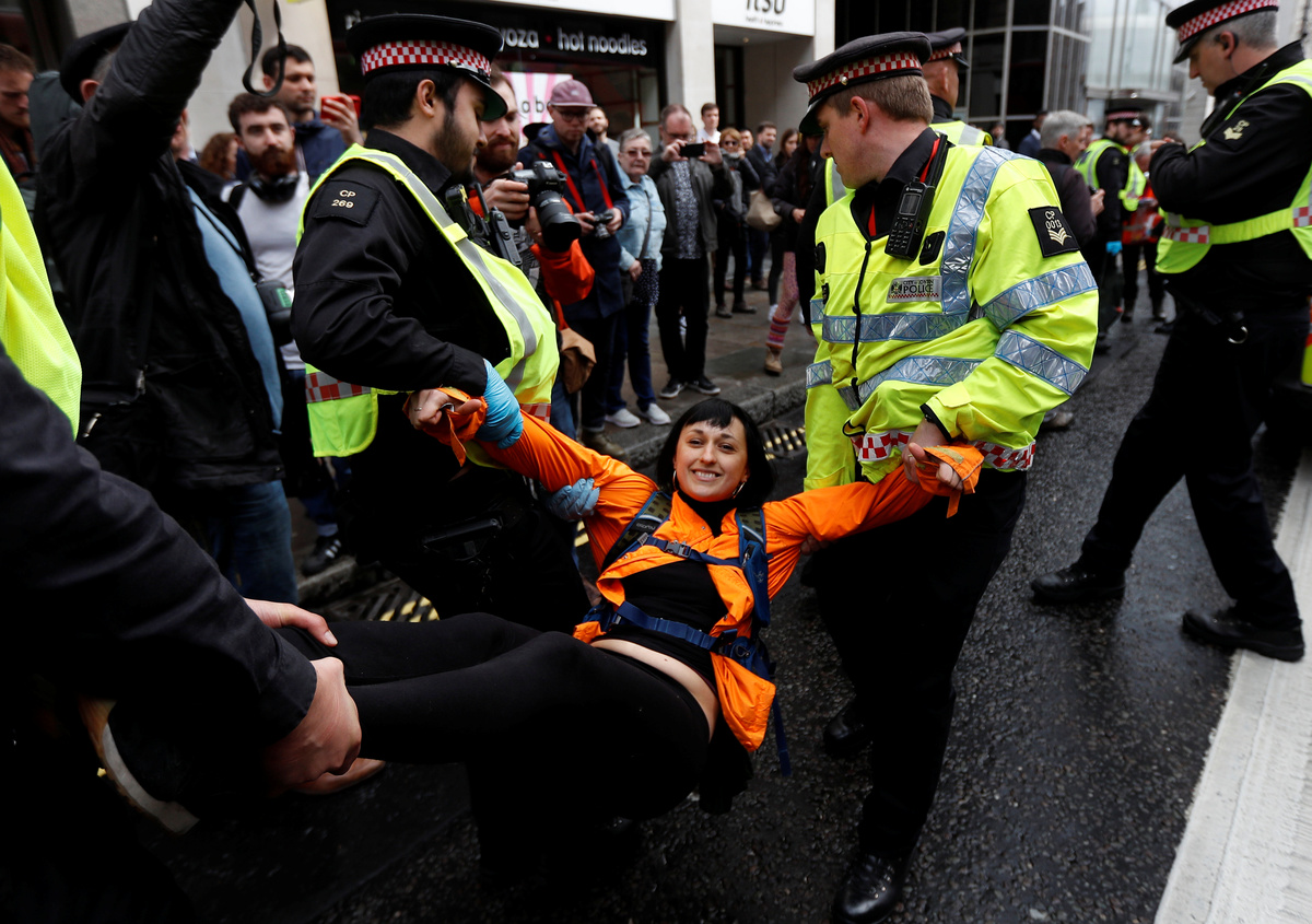 A protester is taken away by police as demonstrators block traffic outside The Bank of England during the Extinction Rebellion protest in London, Britain April 25, 2019. REUTERS/Simon Dawson