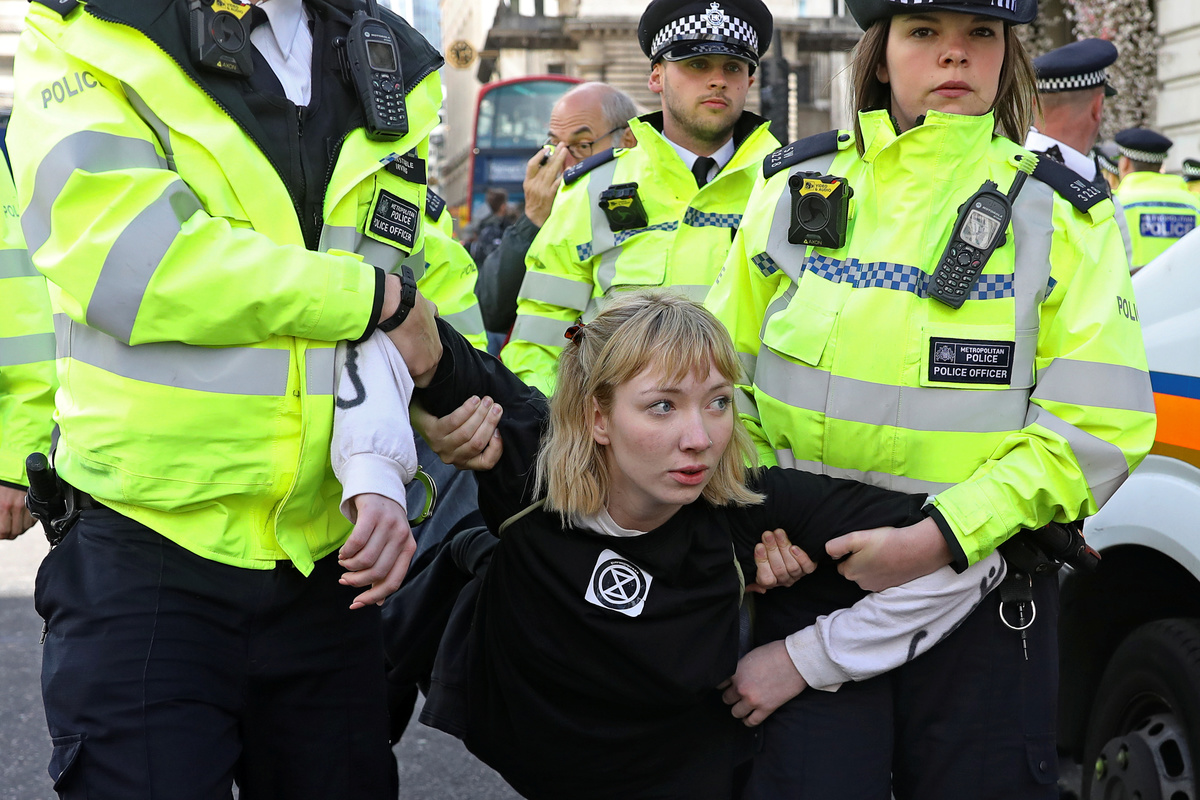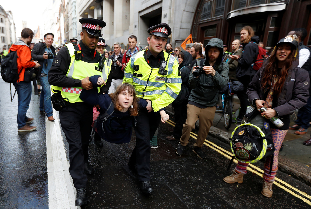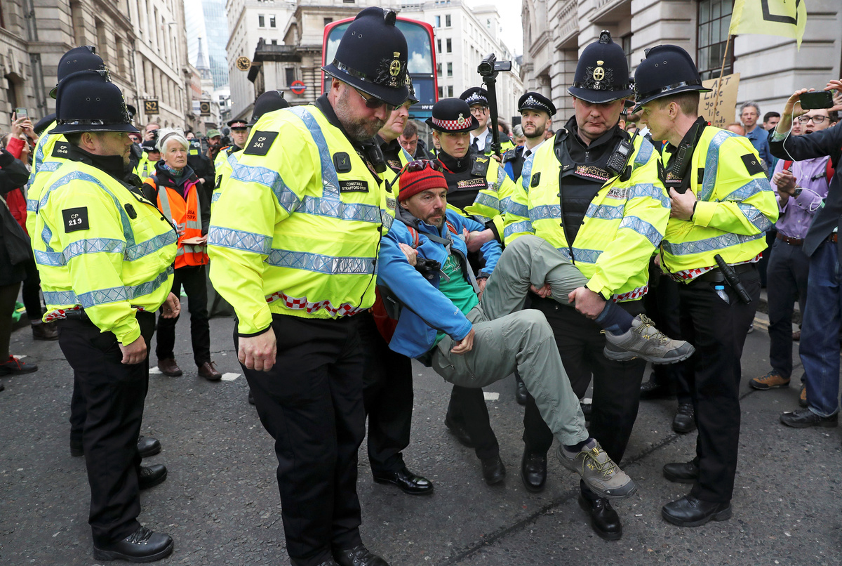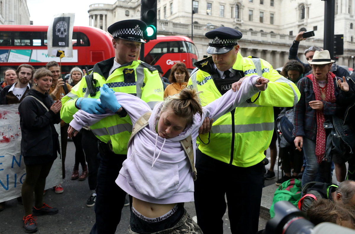 A protester is taken away by police as demonstrators block traffic outside The Bank of England during the Extinction Rebellion protest in London, Britain April 25, 2019. REUTERS/Simon Dawson