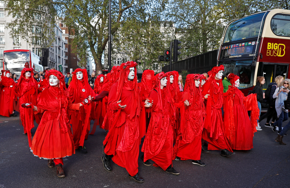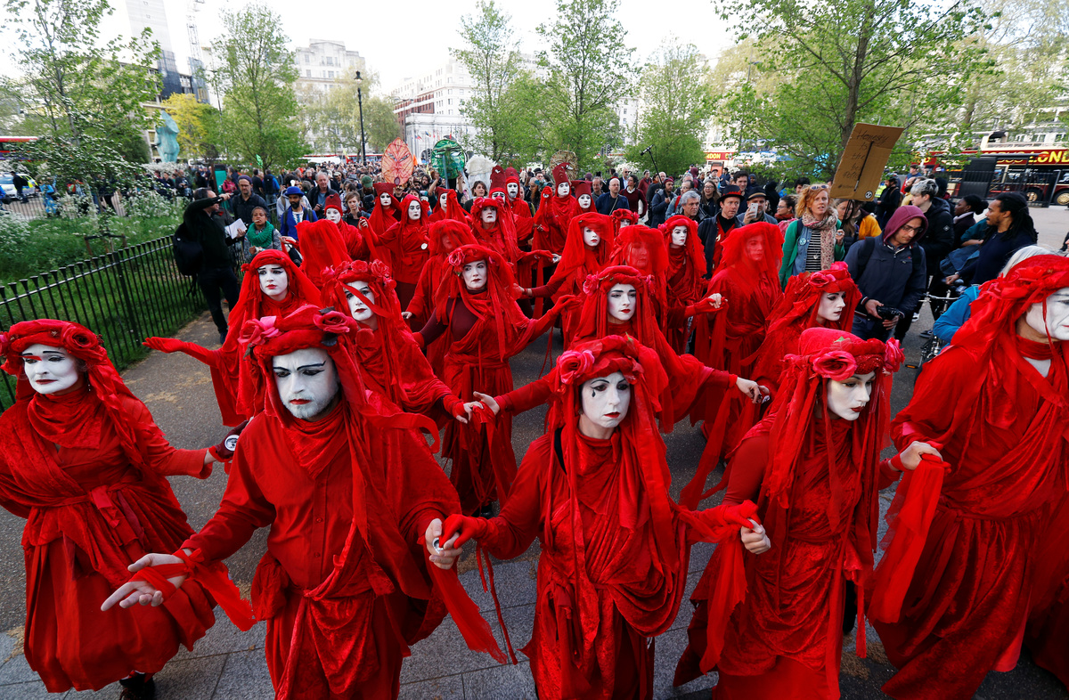 Climate change activists, dressed in red with white face paint, take part in the Extinction Rebellion protest in London, Britain April 25, 2019. REUTERS/Peter Nicholls