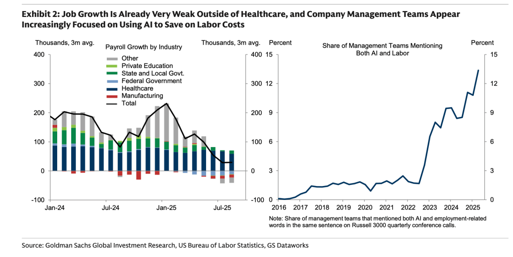 This shift is clear in data collated by the investment bank. Payroll growth by industry shows almost all sectors outside health care posting weak, zero, or even negative net job creation, despite otherwise solid macroeconomic indicators. Meanwhile, the share of executives who mention both AI and employment in the same context on earnings calls has reached historic highs.