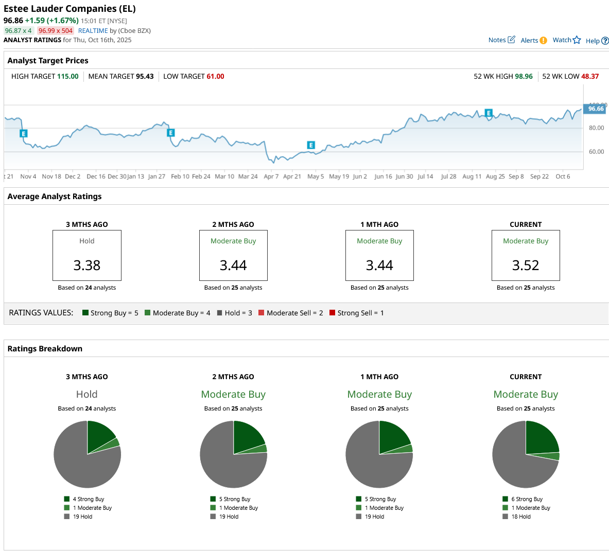 Out of the 25 analysts covering EL stock, six recommend “Strong Buy,” one recommends “Moderate Buy,” and 18 recommend “Hold.” The average Estee Lauder stock price target is $95.43, which is similar to the current trading price.