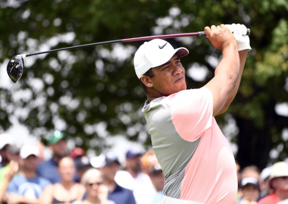 World number one Dustin Johnson was making his own charge with four front-nine birdies but failed to find any consistency after a two-hour rain delay that began right after his tee shot at the 10th landed next to a parking lot.