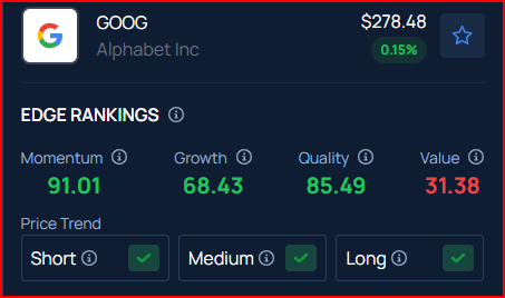 Benzinga's Edge Rankings place Google in the 85th percentile for quality and the 91st percentile for momentum, reflecting its strong performance in both areas. Check the detailed report here.